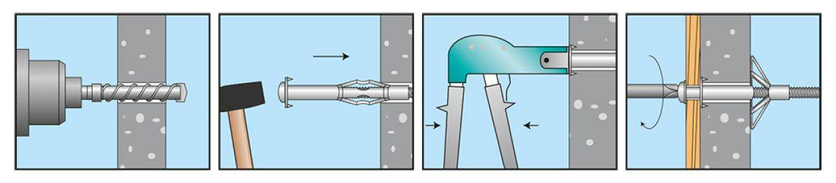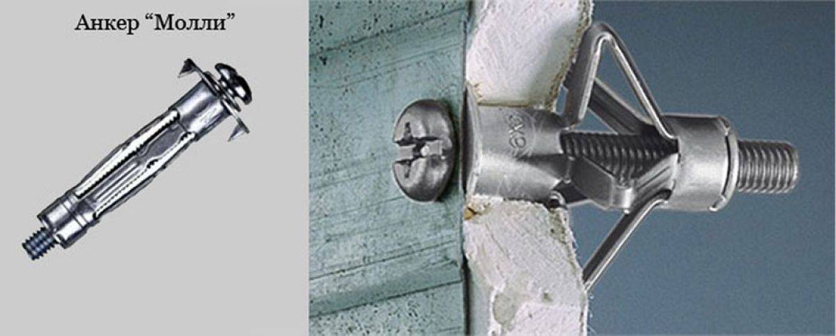 Дюбель, похожий в рабочем положении на спицы полураскрытого зонтика, носит ласковое имя Молли и отлично подходит для крепления деревянных брусков к перегородкам из гипсокартона, с целью закрепить на них картины, нетяжелые полки или светильники. Молли — вид распорного анкерного болта, имеющего втулку с продольными прорезями, которая при затягивании резьбы вставляемого винта до упора складывается и превращается в зонтик. Несущая способность отличная, но это крепление имеет недостатки — удалить его можно, только выломав часть перегородки. Кроме того, с “Молли” невозможно работать в тесном пространстве.