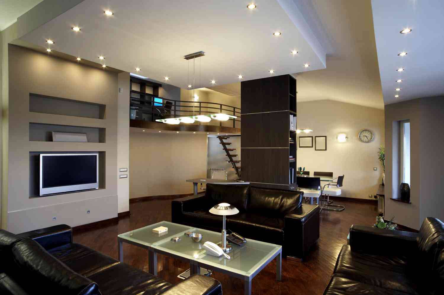 Над зоной, предназначенной для отдыха, можно не делать подсветку, ее полностью способно заменить бра на потолке. Отказаться от подвесных люстр допустимо при создании освещения, как в гостиной, так и в зале при условии, что будет установлено несколько мощных светильников, имеющих наружное расположение.