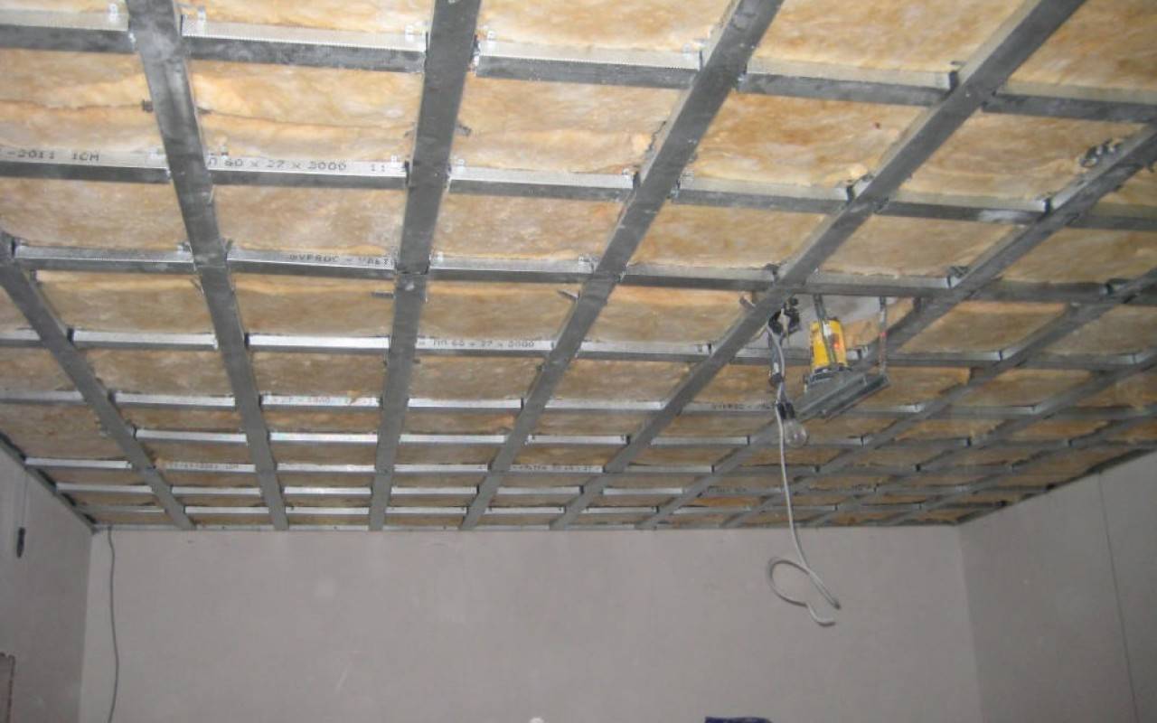 Между чистовым потолком и перекрытиями остается расстояние 20-25 см, в котором можно разместить звуко- и теплоизоляционные материалы. В этом случае сначала монтируют каркас из деревянного бруска для волокнистых плит утеплителя, располагая его так, чтобы он был смещен относительно каркаса подвесного потолка. Укладывают утеплитель и закрывают его паропроницаемой влагоизоляционной пленкой. При использовании пенополистирола, его крепят прямо к черновому потолку на клей и дюбели-грибки.