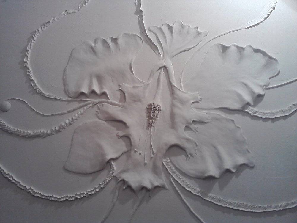 Мастихином и акриловой смесью прокладывают стебли, стараясь, чтобы центральная часть была самой высокой в композиции. Выписывают лепестки, середины, делая тычинки крупно фактурными. Лепесток одной стороной возвышается, а другая прилегает к стене.