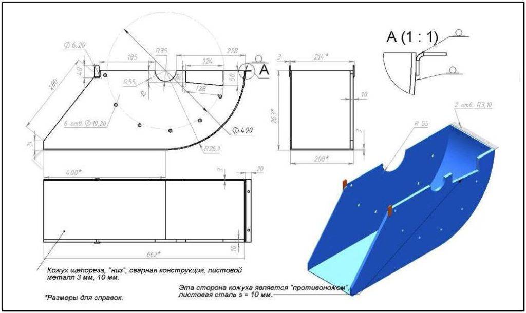 Для защитного кожуха щепореза, а также воронки приемного бункера изделия сгодятся листы металла толщиной не менее 8-12 мм. Для нарезки нужного размера заготовок применяют чертежи. Удобнее будет подготовить выкройки из плотного материала, например картона, а затем вырезать заготовки уже из металла. Следом производятся сварочные работы для формирования объемного вида изделий и устанавливаются ребра жетскости, в качестве которых используют уголки из металла или трубы.