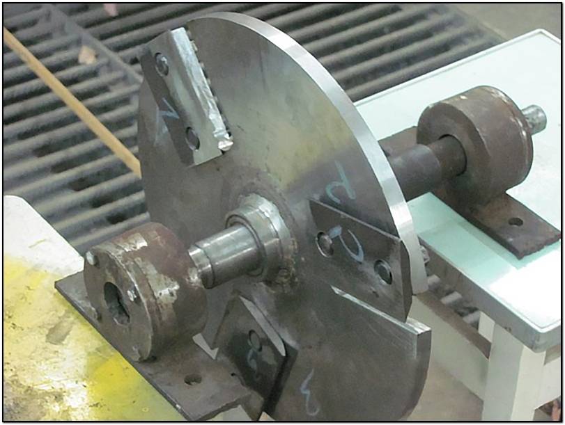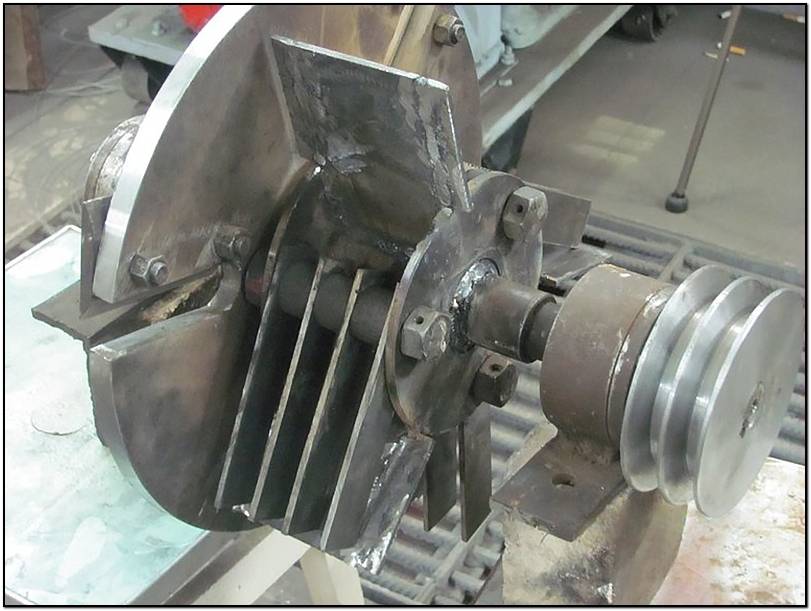 Оборудование дробильного узла: цапфы вала, на которые необходимо насадить опорные подшипники, плюс била (молотки) и режущий диск. Следующий шаг по изготовлению щепореза — нужно вырезать отверстия для рабочего вала, а также входные и выходные раструбы для подачи сырья и выхода щепы.
