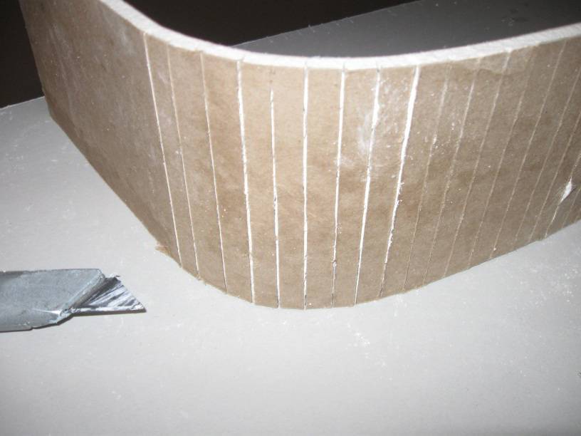 - Любой ГКЛ (стеновой, влагостойкий, потолочный, огнестойкий) можно формировать так, как гнуть профиль для гипсокартона, то есть, делая надрезы в зоне наибольшего сопротивления. Для этого вырезается нужный кусок и со стороны предполагаемой выпуклости делаются равномерные надрезы и чем круче изгиб, тем мельче будет шаг резаных полос.
