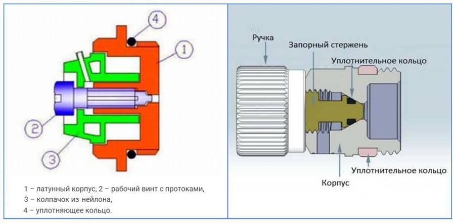 Краны Маевского, или воздушные клапаны, ставят в многоквартирных домах вместо запорно–регулировочной арматуры. Такая конструкция позволяет стравливать воздух и сливать воду. Кран представляет собой заглушку с головкой, на которой находится отверстие или желоб. В середине расположен кран под шлицевую отвертку. Самые удобные конструкции оснащены поворотным ключиком.