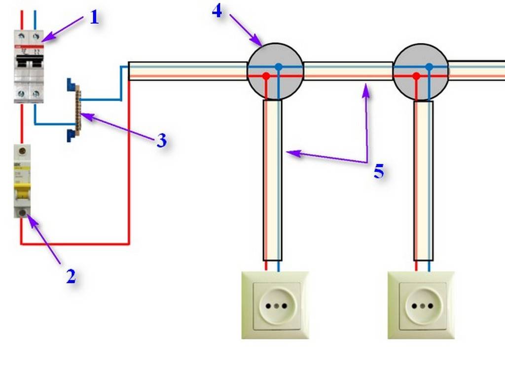 2 – автомат, отключающий фазу на линии, к которой будут подсоединяться розетки.