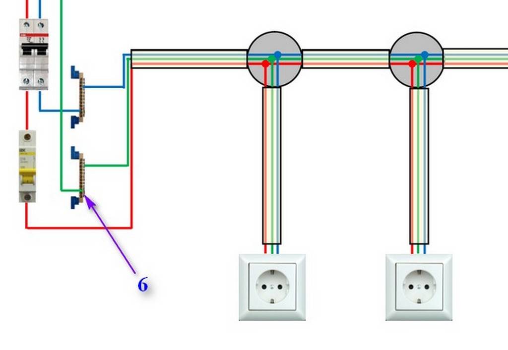 - Заземление. При его наличии в первой розетке монтируют и на последующих, учитывая требования ПЭУ, где указано об использовании цельного кабеля.