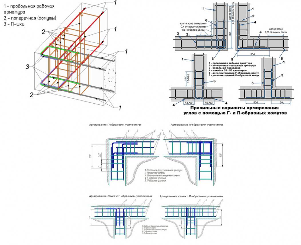 Повышенную сложность представляют участки, требующие дополнительного усиления – это углы и области примыкания фундаментных лент. Подробно об этом рассказывается в соответствующей статье.