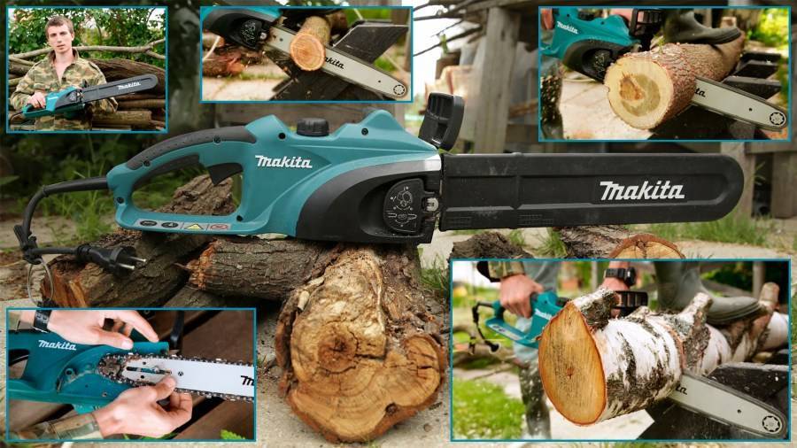 Инструмент оснащен шиной длиной в 35 см, что позволяет с легкостью распиливать бревна на чурки. Стандартный шаг составляет 3/8 дюйма. Небольшой вес Makita UC3541A делает работу с моделью не трудной, а также безопасной. Мощность оборудования примерно 1800 Вт. Несмотря на поперечное расположение двигателя, агрегат отличается маневренностью и удобством. В наличии прорезиненная ручка и специальный рычаг, за счет которого возможно без труда отрегулировать натяжение. В отзывах о цепной электропиле Макита пользователи отмечают оснащенность модели защитой от отскока и блокировкой произвольного пуска.