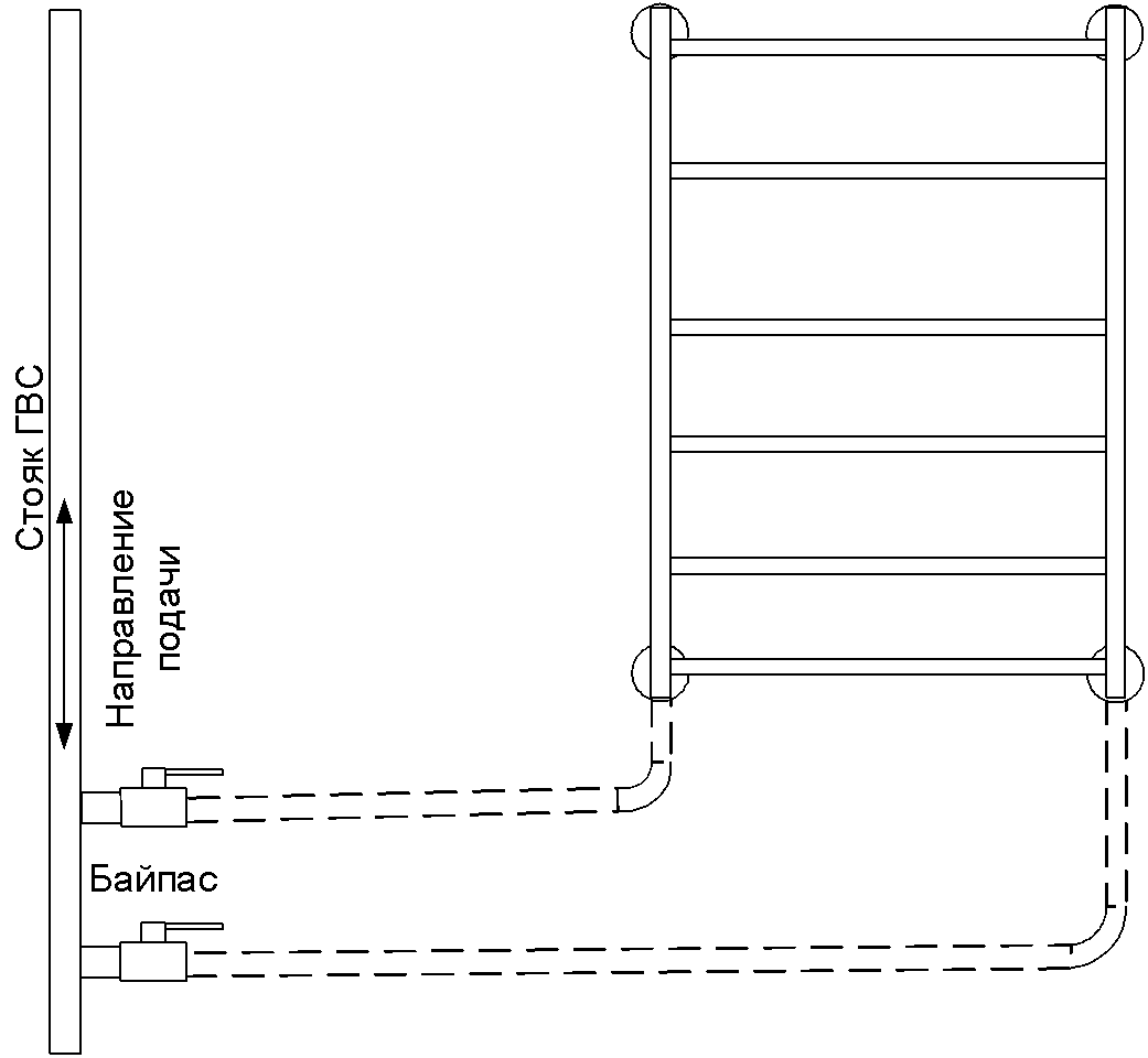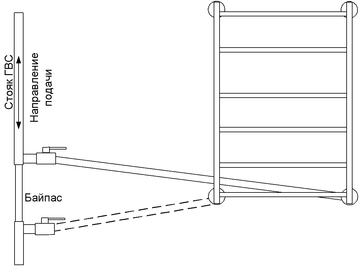 Низ прибора находится между отводами. При нижней подаче в стояке, малой высоте полотенцесушителя или большом расстоянии между отводами эта схема может не работать или работать нестабильно.