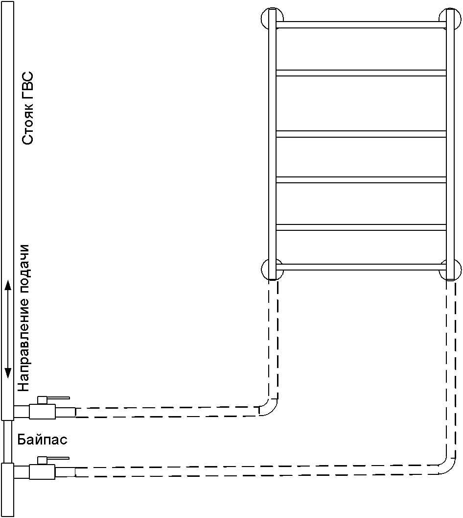 Категорически нельзя на байпасе ставить краны. Каждый кран — это потери давления, а значит, он ухудшает циркуляцию всего стояка, вода течет уже не такая горячая. У всех соседей выше или ниже (зависит от направления подачи) заметно ухудшается напор. Иногда он падает и у владельца байпаса с краном. Ко всему, это абсолютно ненужная деталь, которая приносит только вред, а сколько-нибудь заметного улучшения циркуляции в полотенцесушителе не наблюдается. Ну, и кроме того, это нарушение СНиП 31-01-2003 (п 10.6) — вмешательство в общедомовые коммуникации, за что может быть выписан штраф (немалый).