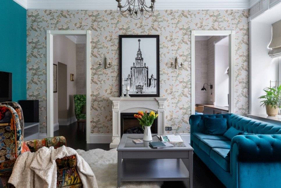 Еще один способ предполагает оформление дизайна гостиной обоями двух видов на разных стенах. Вы можете создать одну акцентную стену, а можете чередовать разные обои по определенному принципу (например, наклеить одинаковые обои на противоположные стены). Такой вариант идеален для оформления зоны с диваном, телевизором или камином.