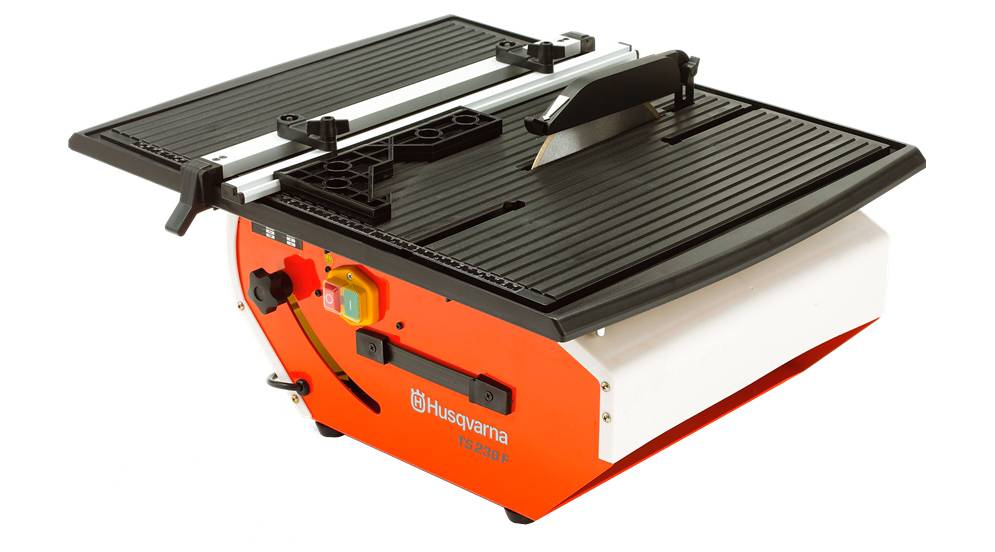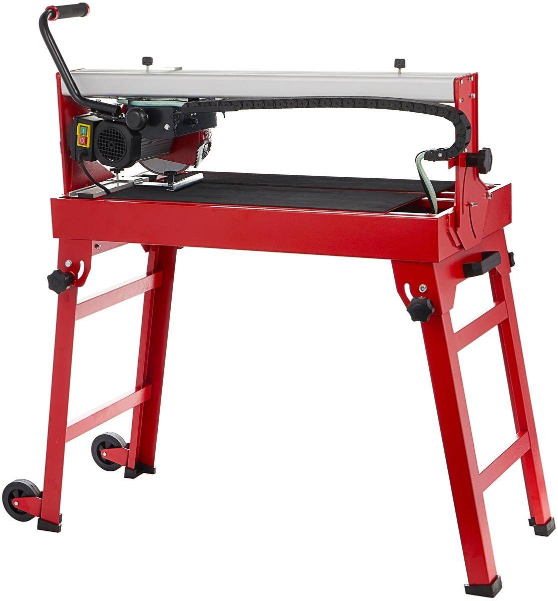 Водяное охлаждение, высокая мощность, 20-сантиметровый диск… Всё это есть в модели. Особенностью является верхнее расположение двигателя, при котором режущий блок перемещается по направляющей и разрезает разные виды керамических плиток. Пильный диск закрывается кожухом для исключения травмирующих ситуаций, защиты от пыли, искр, осколков.