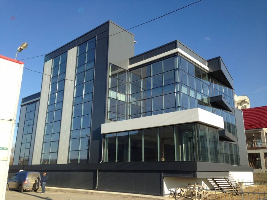 Фасад здания выполнен при помощи светопрозрачных конструкций