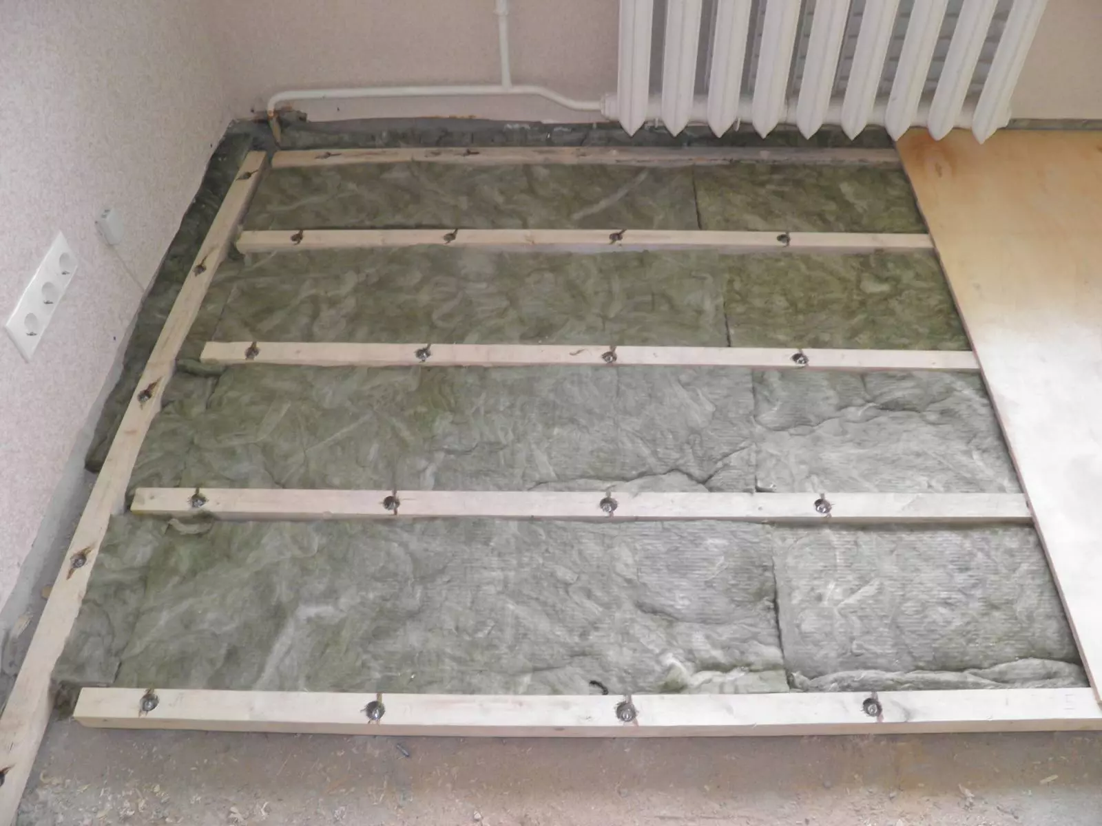 Прежде всего, необходимо найти самую высокую точку пола и начать монтаж лаг именно оттуда. В местах, где лага не прилегает к полу под нее нужно проложить прокладки. Располагать лаги необходимо с шагом шириной в полметра, подгоняя каждую лагу под уровень уже уложенных.