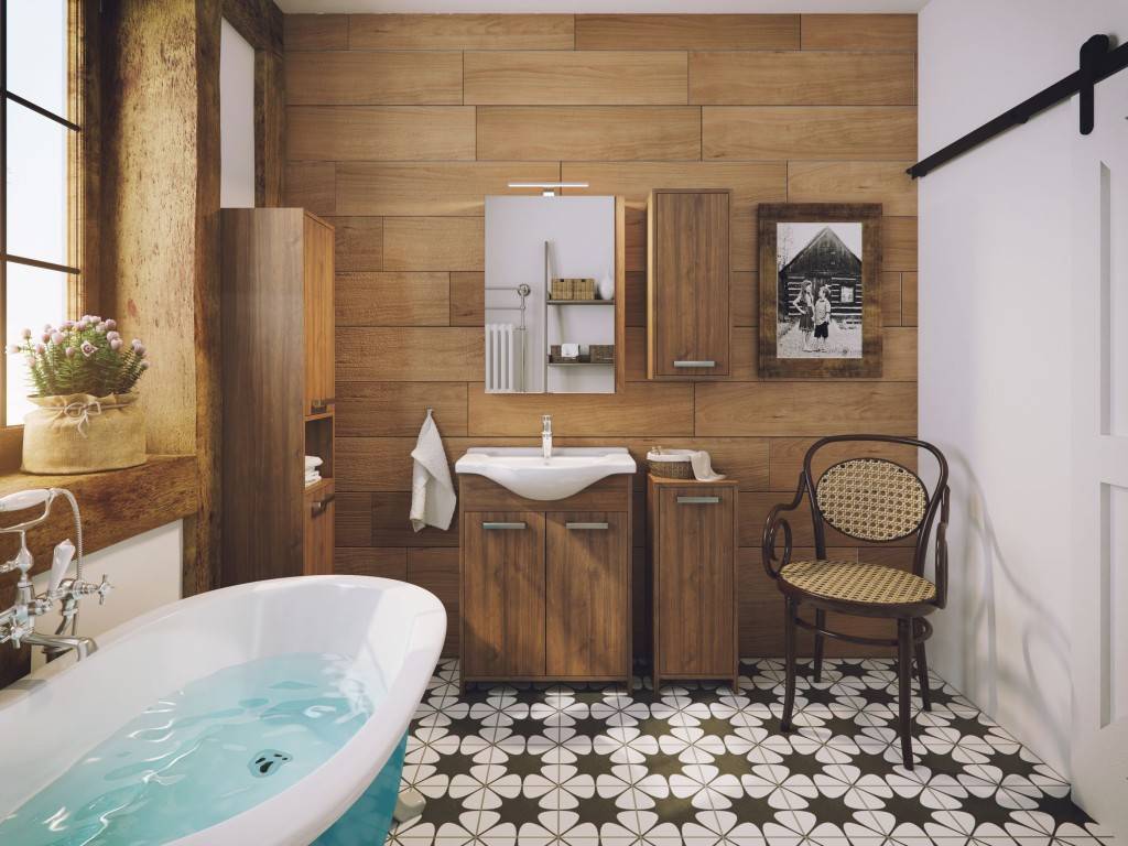 Минимальный комплект мебели для ванной состоит из навесного шкафчика и тумбы под раковину. Для просторных комнат гигиены выбирают шкаф с полками для полотенец, халатов и других аксессуаров, корзину для белья, комод, банкетку или кресло.