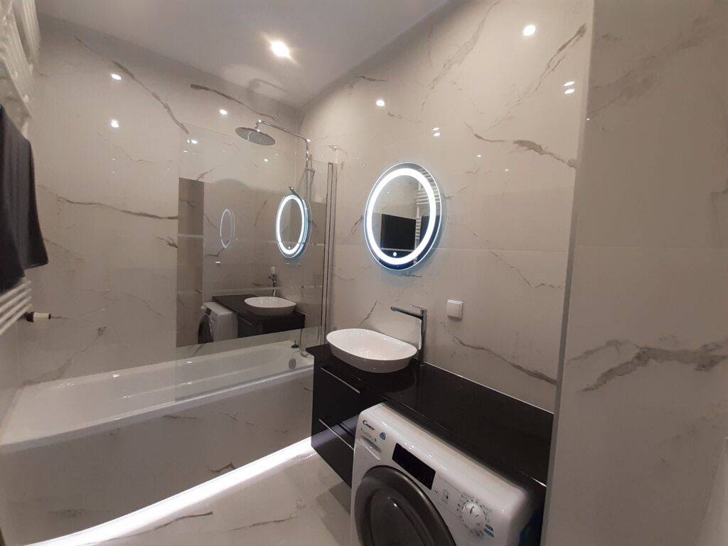 Этим материалом можно покрыть пространство вокруг ванны, но также сделать душевую зону. Полированный керамогранит может быть скользким, поэтому вы должны тщательно подумать о выборе его типа. Он имеет дополнительный защитный слой, благодаря которому плитка более устойчива к обесцвечиванию и не впитывает влагу. Декоративный слой увеличивает декоративную ценность. Современные технологии также позволяют получить необычный дизайн.