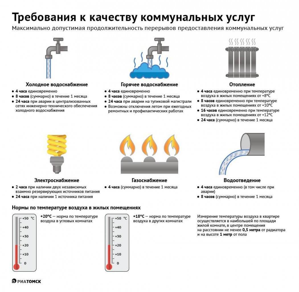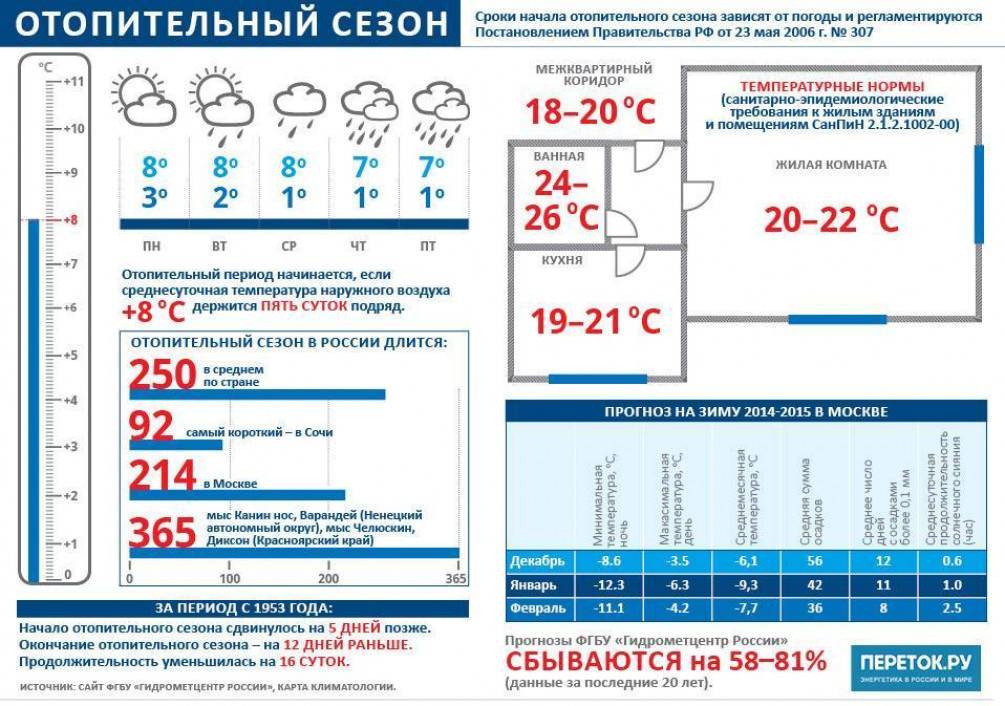Начало отопительного сезона в многоквартирных домах наступает при снижении температуры воздуха на улице ниже уровня +8°С. Коммунальные службы сравнивают среднесуточные температуры в течение пяти дней. Квартиры должны отапливаться . Закон допускает незначительные перебои с отоплением в течение 24 часов, при этом единовременное отключение отопления не может превышать 16 часов, если температура воздуха в жилых помещениях составляет от 12 до 22 градусов.