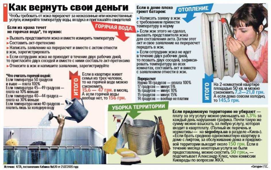 Если в квартире слишком холодно или жарко, жильцы имеют право оформить письменную жалобу и направить ее в аварийно-диспетчерскую службу. Документу присваивается регистрационный номер. Далее коммунальные службы обязаны произвести проверку помещений и составить акт, на основании которого возможен перерасчет коммунальных платежей. При выявлении техническими смотрителями грубых нарушений коммунальные службы обязаны исправить положение в течение 2-7 дней, в ином случае производится поквартирный перерасчет коммунальных платежей согласно метражу квартир.