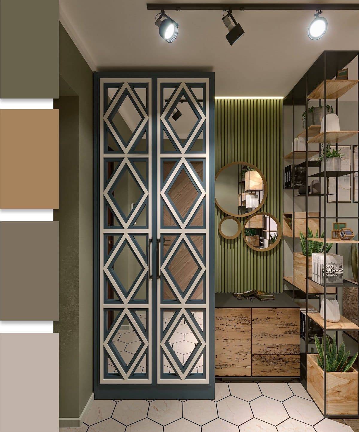 Оливковый относится к теплой гамме, дружелюбен со многим тонами. Если сочетать с холодными и светлыми, комната будет шире визуально, а если с темными – создастся приватная, интимная атмосфера, что подходит для интерьеров спальни.