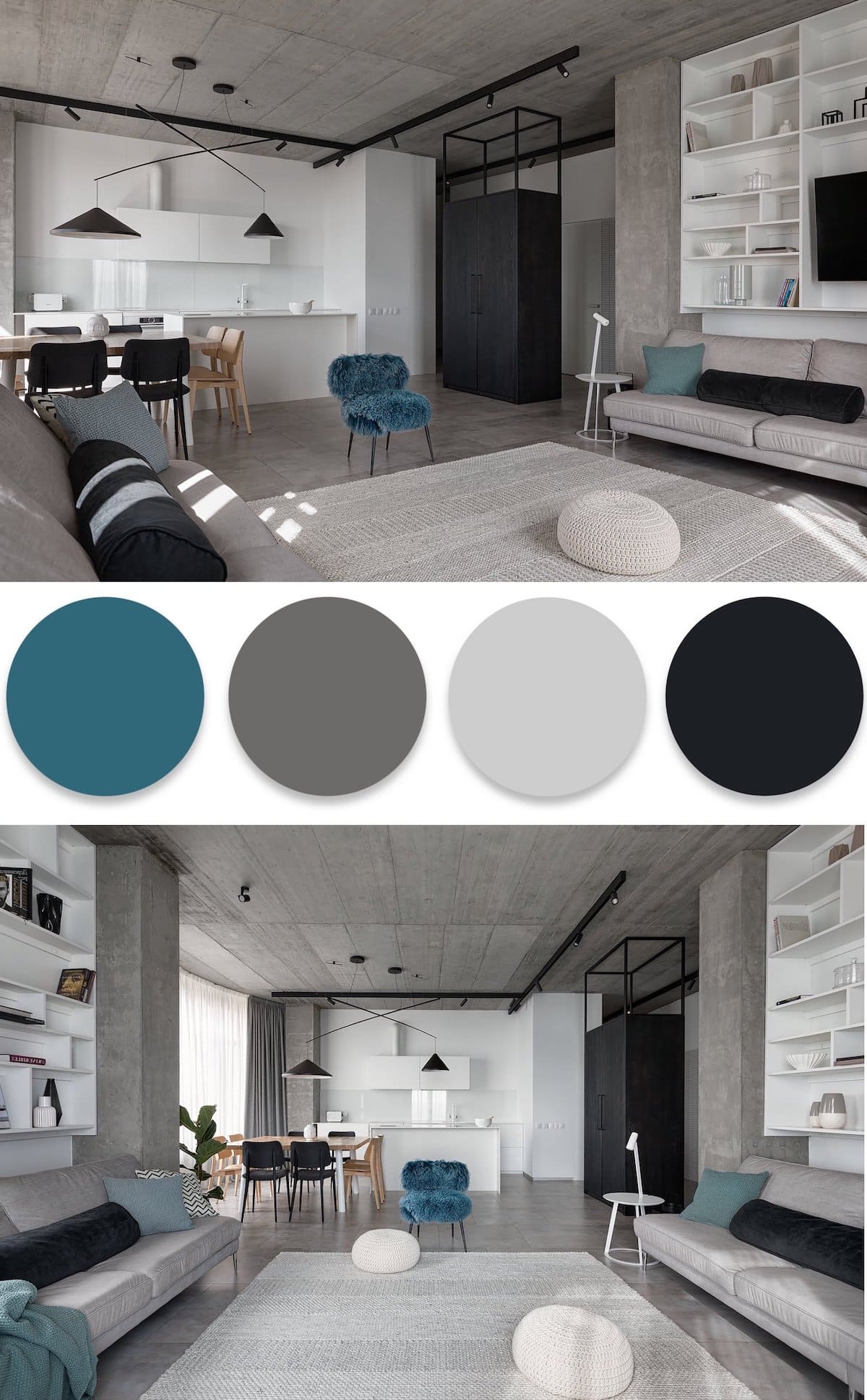 Однотонное помещение будет выглядеть скучно. С серым в интерьере необходимо сочетать другие расцветки, чтобы сделать интерьер более насыщенным и гармоничным. Есть несколько подходящих тонов, благодаря которым обстановка получится уютной.