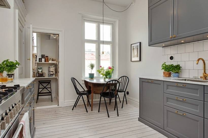 Лаконичный серый цвет обоев на стенах, помогает создать элегантную атмосферу на кухне