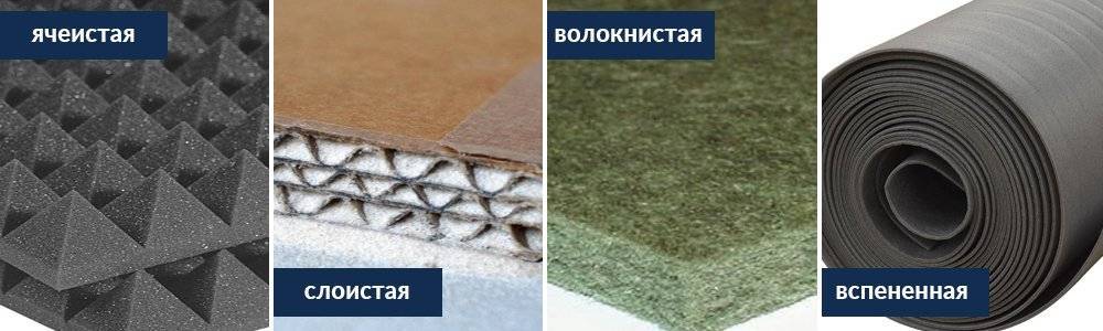 Волокнистые. Различные эковаты и картоны. Хорошо нивелируют структурные шумы, но не подходят для квартир с низкими потолками. Стоят дешево, но имеют малый эксплуатационный срок.