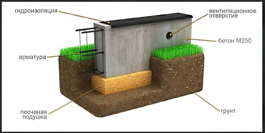 Траншеи копаются на глубину 1,5 метра, на дно насыпается слой гравия и песчаная подушка. Прокладывается целлофан, чтобы исключить обезвоживание бетонной смеси, и устанавливается опалубка из досок.