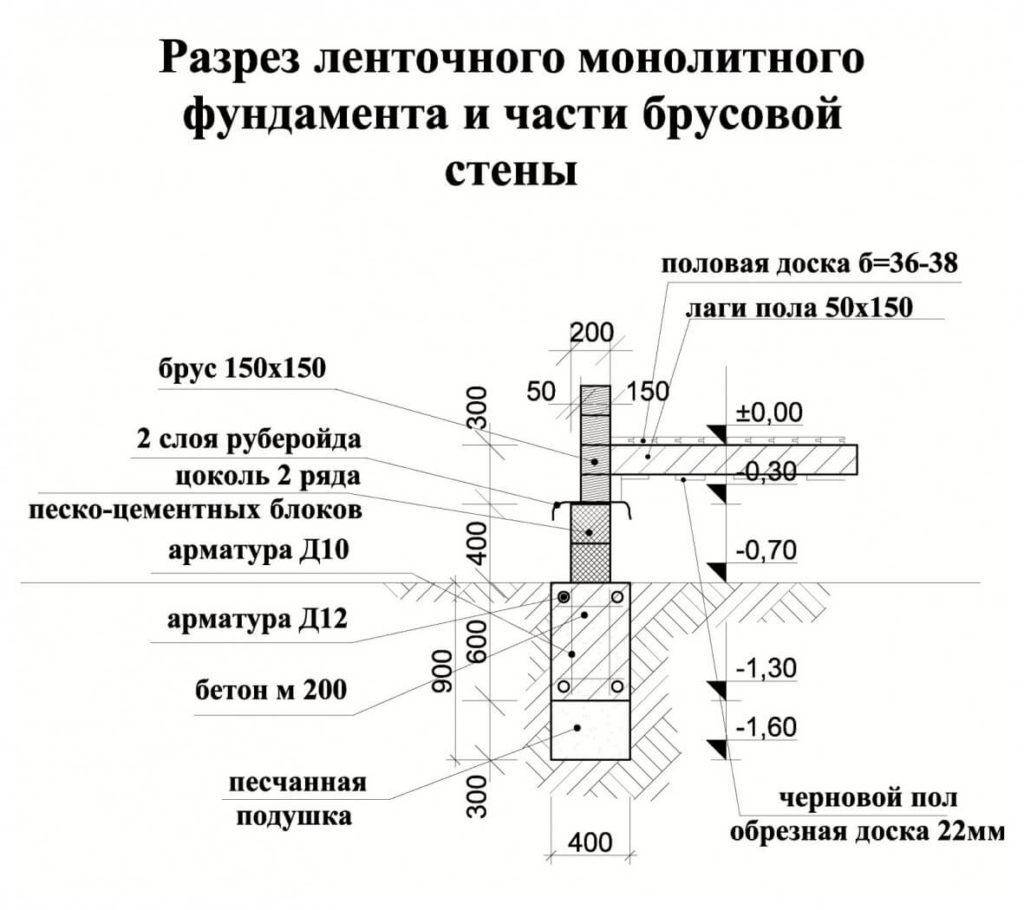 Результатом расчетов ленточного фундамента монолитного типа является чертеж, на котором показано сечение монолитной ленты с рассчитанными размерами: