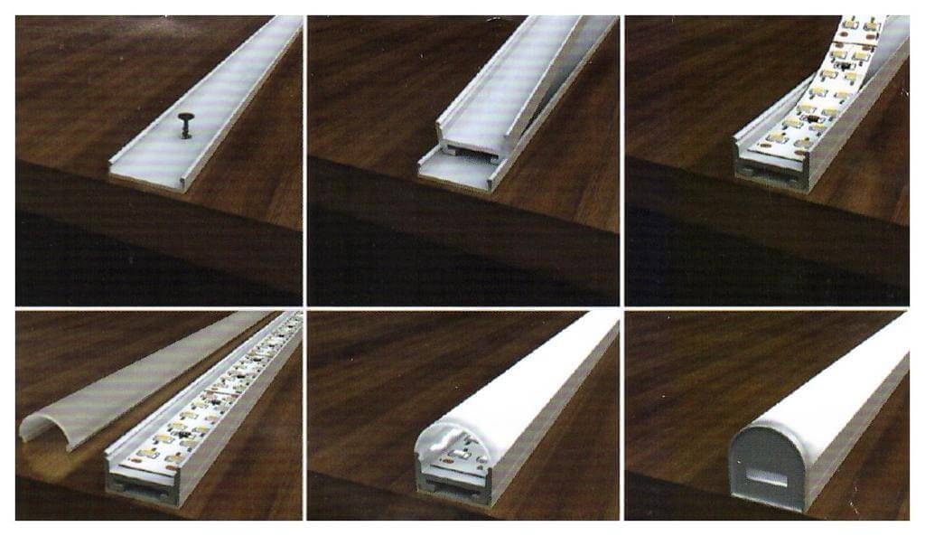 Монтаж светодиодной ленты на алюминиевый профиль производится в три этапа: