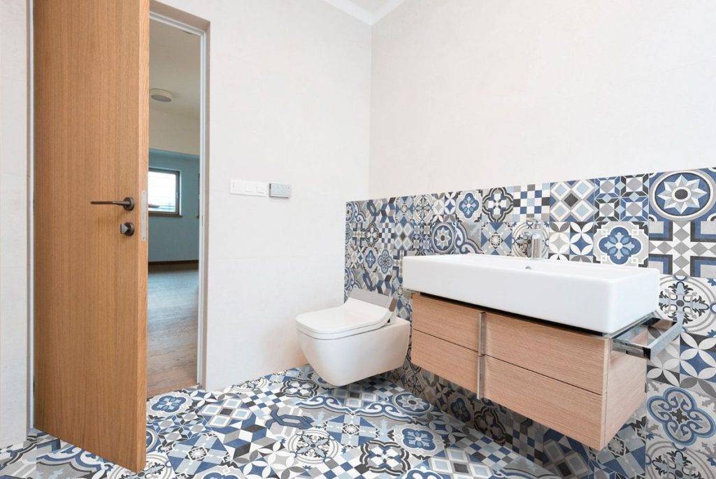 Кафель для ванной с орнаментами и узорами — неплохой вариант для ярких акцентов, но с ним важно не переборщить. Рекомендуют выделить декором одну стену или только часть, а остальное выложить фоновой отделкой