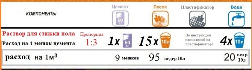 Пропорции компонентов для стяжки пола на 1 мешок цемента и на 1м3
