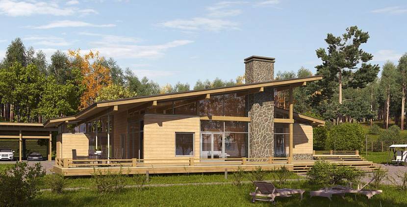 Оригинальная постройка с использованием крыш разного уровня. Достаточно просторный дом с большой площадью остекления, что позволяет полноценно наполнять помещения солнечным светом. Для создания тени, крыша делается с большими свесами, которые частично закрывают и террасу. Подходит для круглогодичного проживания, используя как загородный коттедж.