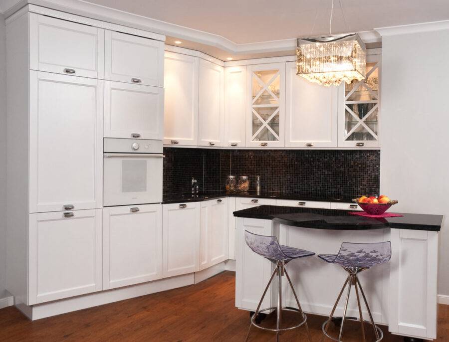 На фото кухня, неправильную форму которой сглаживает белый керамический фартук.
