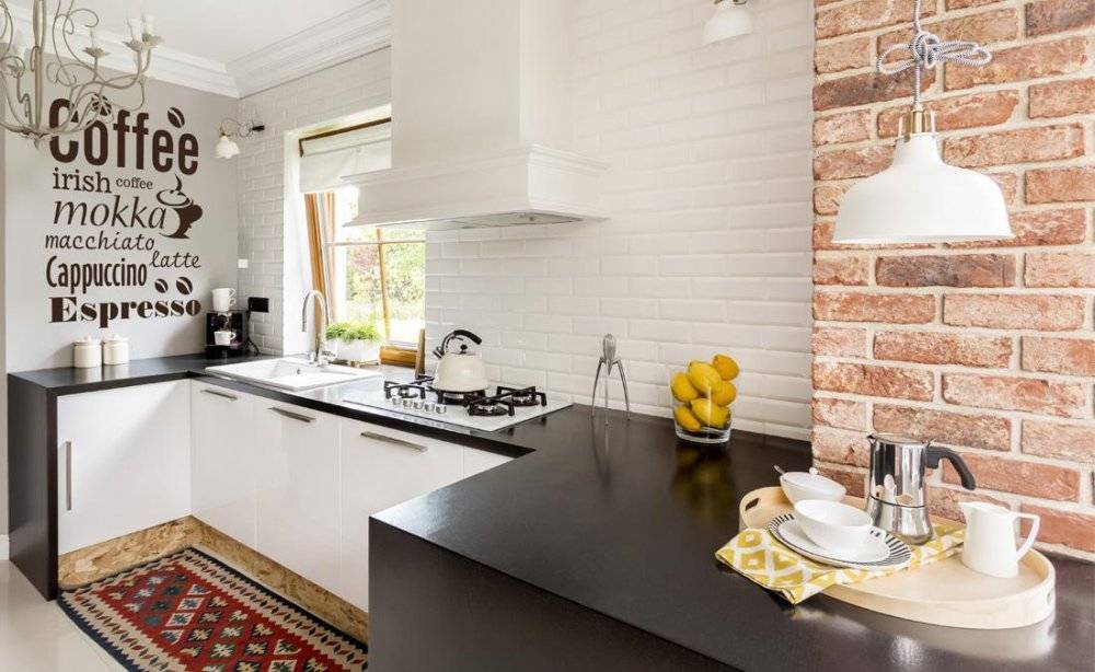- для оформления кухни в стиле прованс или кантри можно использовать цветные элементы. Для лофт или индустриал удачным выбором будет кафель чёрного цвета.