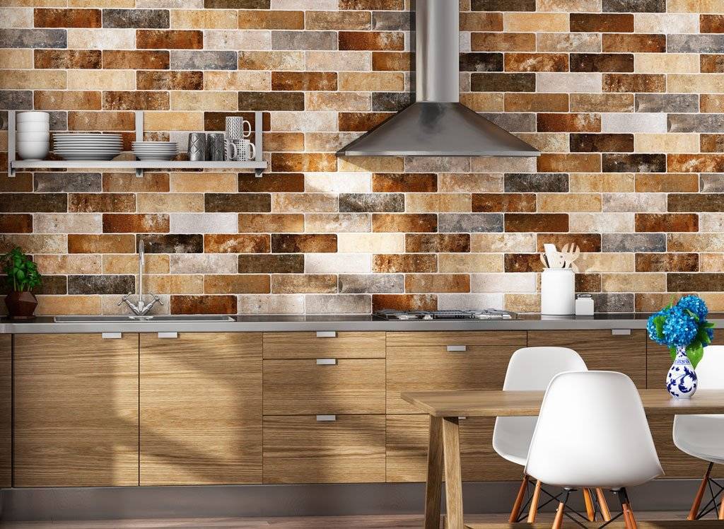 В любом магазине можно встретить большой ассортимент плитки в виде кирпича. Ее форма прямоугольная и имеет скошенные фаски. В народе она называется — плитка «кабанчик», на фартук она подходит идеально, поскольку впишется в любой интерьер, классику или современный.