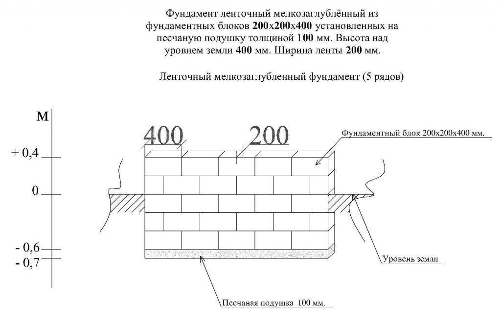Выкапывается котлован, примерно на 200 миллиметров ниже отметки промерзания грунтов в данном регионе. После этого, насыпается и утрамбовывается песчаная подушка, толщиной 300 миллиметров. Далее целесообразно залить небольшой бетонный, армированный ростверк, примерно 150 миллиметров по толщине. На данном ростверке устраивают гидроизоляцию.
