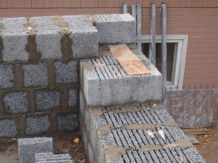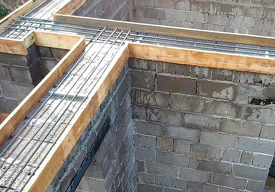В них помещается арматурный каркас, и все заливается бетоном, который уплотняется штыкованием, затем поверхность необходимо выровнять.С использованием готовых железобетонных перемычек. Их укладывают на слой раствора с перепуском от 100 мм для ненесущих конструкций и не менее 250 мм – для несущих.Также можно применять стальной прокатный профиль (уголки, квадратные трубы) в качестве несъемной опалубки-подпорки. Поверх можно просто класть керамзитоблоки с обычной перевязкой.