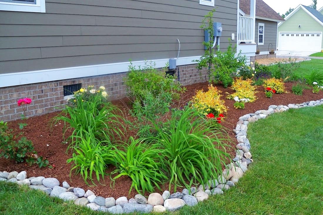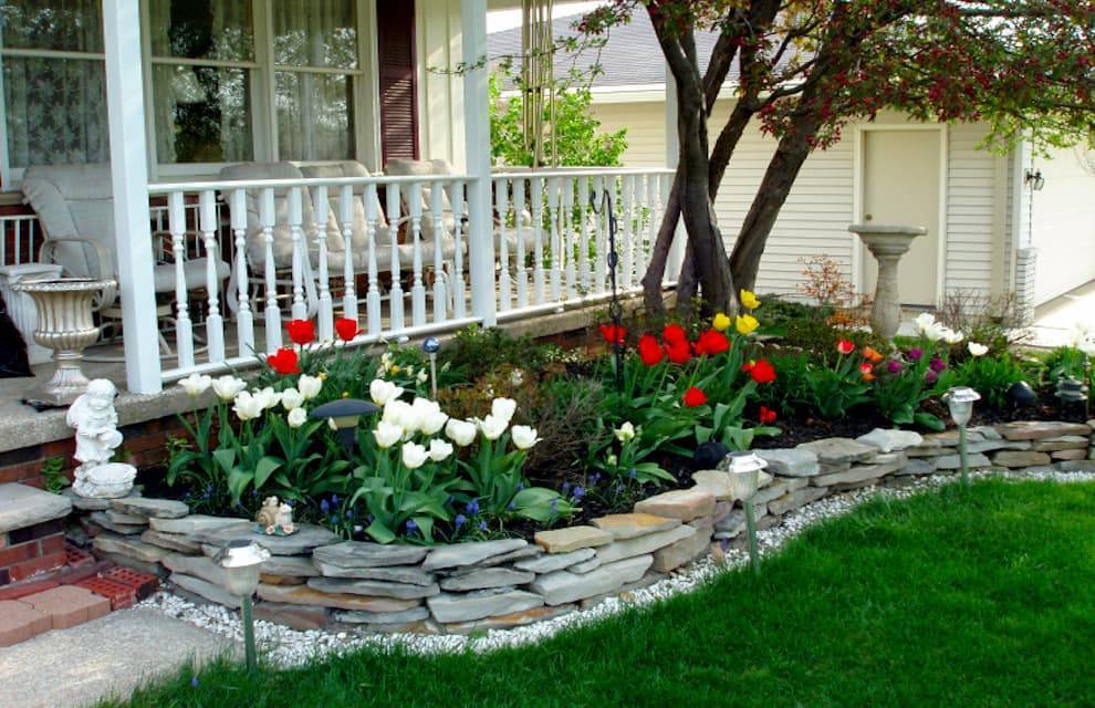 Очень красиво будет смотреться аккуратная клумба у дома, обложенная натуральным камнем