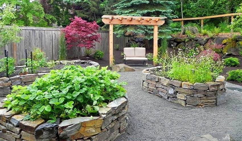 В пространствах между камнями сажают растения, съедобную зелень, пряные травы. Часто такие композиции дополняют кустарниками и деревьями, особенно если для сада выделена немаленькая территория.