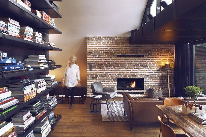 Уютная гостиная на мансарде с камином и открытыми книжными полками