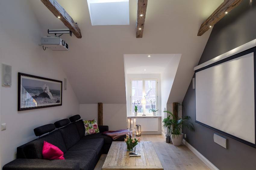 - Комната отдыха или кинозал. Даже если чердак имеет небольшую высоту, в нем можно обустроить небольшое помещение для просмотра фильмов или простого отдыха. Хорошая звукоизоляция защищает от посторонних шумов, а при желании можно еще и продумать акустические характеристики помещения, чтобы создать приятную атмосферу небольшого кинозала.