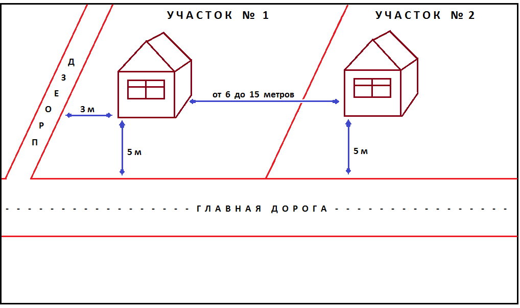 - Между домом и соседним участком – не менее 3 м. Также необходимо учесть расстояния между домами, приведенные выше в таблице.