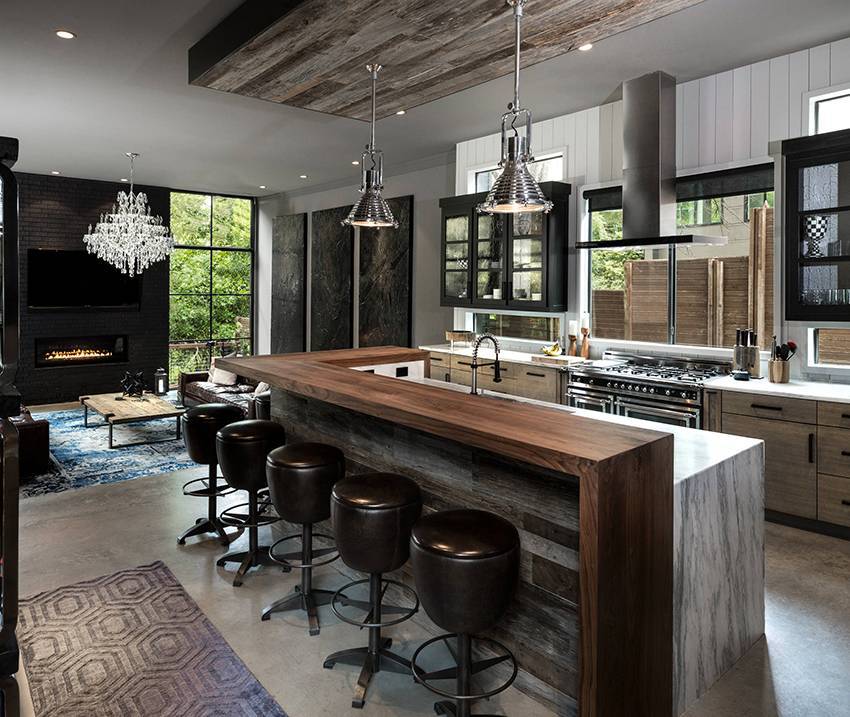 На фото стиль лофт на кухне с барной стойкой, выполненной из необработанных досок.