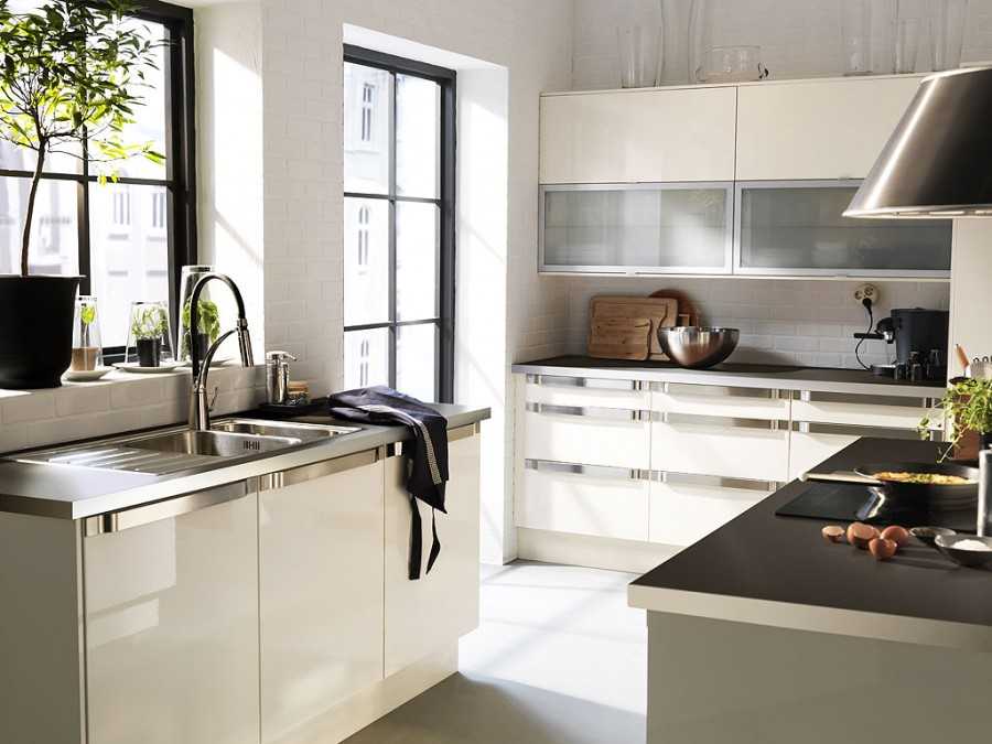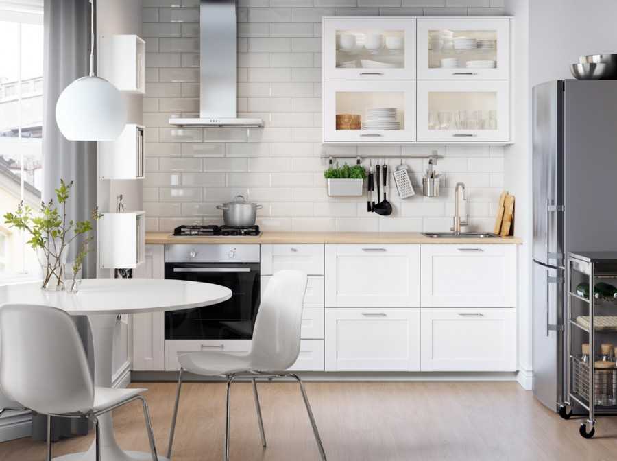 Обратите внимание на белую плитку с практически незаметным узором. Лаконичность, которая украшает любое помещение, будет всегда в моде. Кухни Икеа в расцветке белый глянец