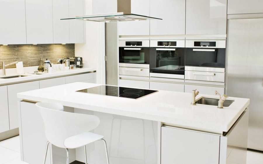 Отличительная особенность белоснежных матовых фасадов — симметричные вертикальные бороздки, составляющие стройный выразительный рисунок в помещении.