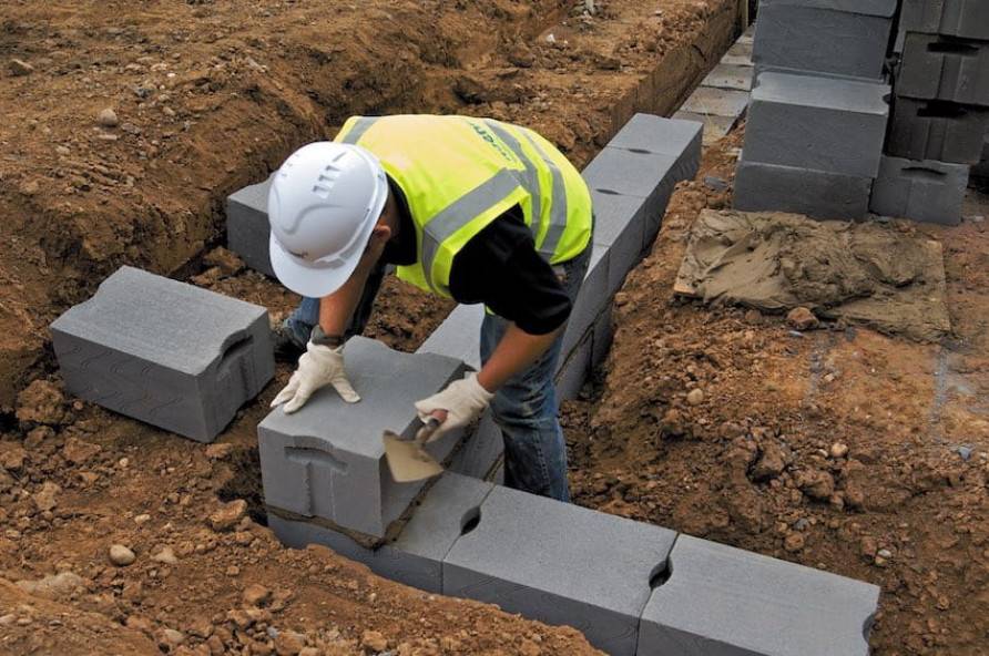 Фундаментные блоки – удобные по размеру, но иногда из-за их массивности без крана не обойтись (надо доставить этот материал на территорию строительства, разгрузить и уложить в траншеи).