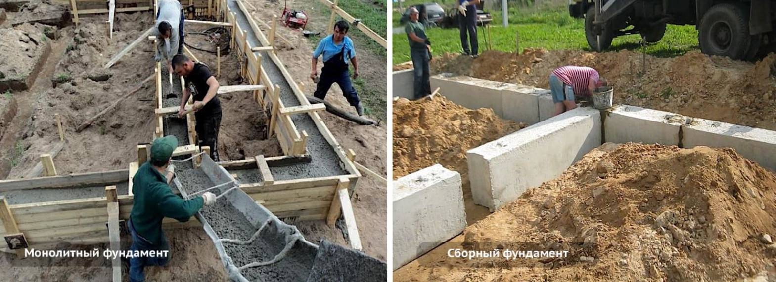 говорит о конфигурации этого вида несущего основания. Фундамент имеет вид непрерывной ленты, расположенной по периметру для опирания наружных и внутренних несущих стен здания. Ленточный вид опорной конструкции может выполняться в виде бетонного монолитного массива или в виде сборных железобетонных или легкобетонных элементов. Так как строительный сезон охватывает короткий весенне-летний период, за который желательно выполнить возведение всего здания, то для сокращения сроков лучшим вариантом будет применение сборного ленточного фундамента.