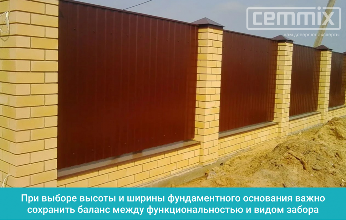 Основание фундамента устраивается шириной чуть больше элементов, устанавливаемых на него, поэтому при установке или кирпича «лесенкой», или готовых ЖБ-изделий оно выполняется шире, чем при монтаже рабицы, профлиста. Здесь важнее не «габариты» фундамента под выбранное ограждение, а его возможность выдерживать вес в длительной перспективе.