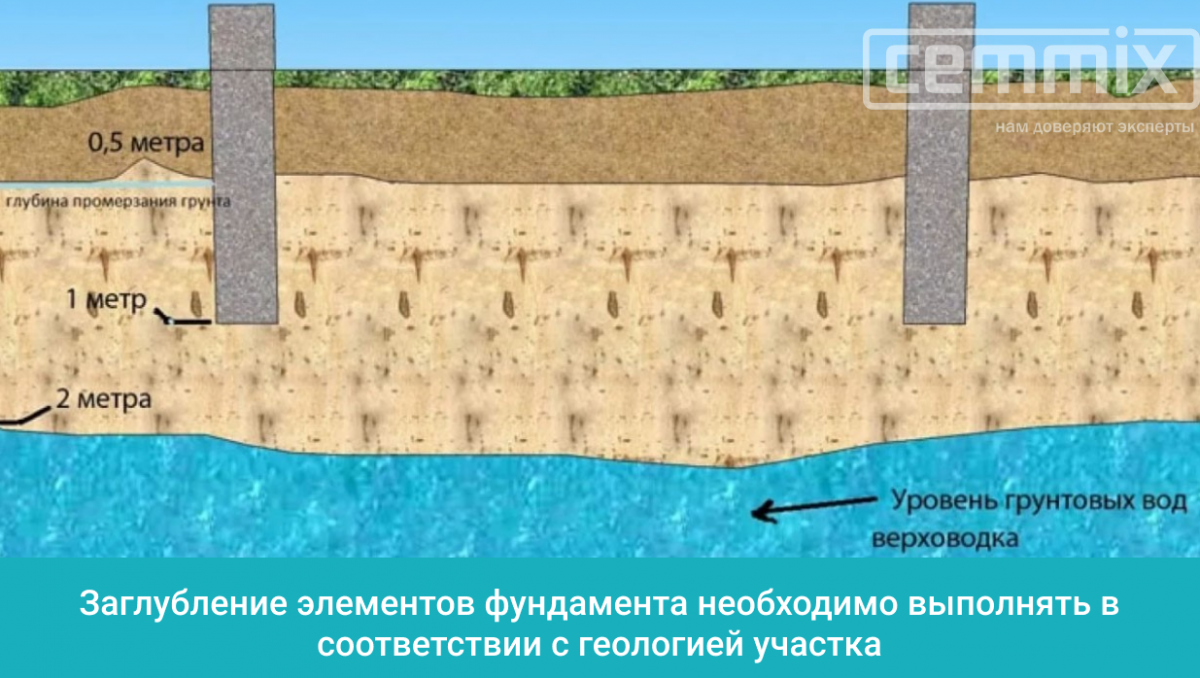 - ростверк обустраивается в местах расположения столбов на глубину промерзания, то есть на 120–1250 см вглубь грунта, а между ними привычная армированная лента.