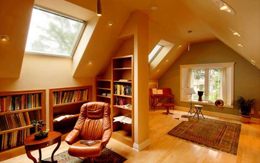 На мансарде можно обустроить кабинет с уголком для занятий музыкойИсточник pinterest.co.uk
